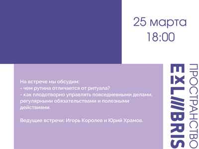 На встрече тайм-менеджмент-клуба «Выкса» участники обсудят разницу между рутиной и ритуалом, а также способы эффективного управления повседневными делами и полезными действиями. Ведущие встречи — Игорь Королев и Юрий Храмов. Это отличная возможность…
