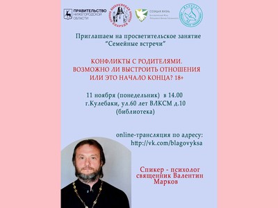 Беседа «Конфликты с родителями. Возможно ли выстроить отношения, или это начало конца?» состоится сегодня, 11 ноября, в 14:00 в Кулебаках и в формате онлайн.