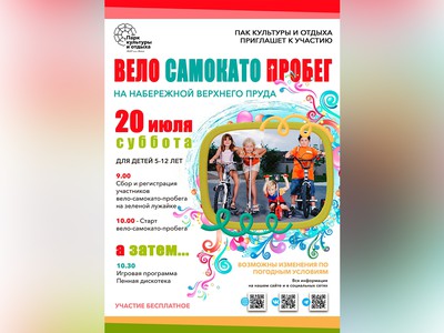 В субботу, 20 июля, в 9:00 на набережной Верхнего пруда состоится детский вело-самокатный пробег «Навстречу солнцу и ветру» (6+)