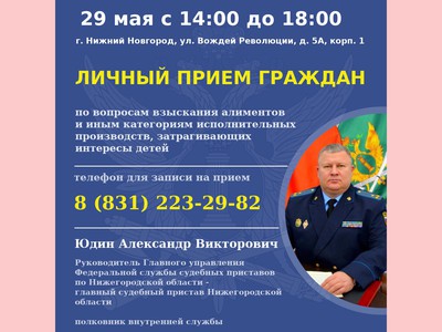 Личный приём Александра Юдина состоится 29 мая с 14:00 до 18:00 по адресу: г. Нижний Новгород, ул. Вождей Революции, д. 5А, корпус 1.
